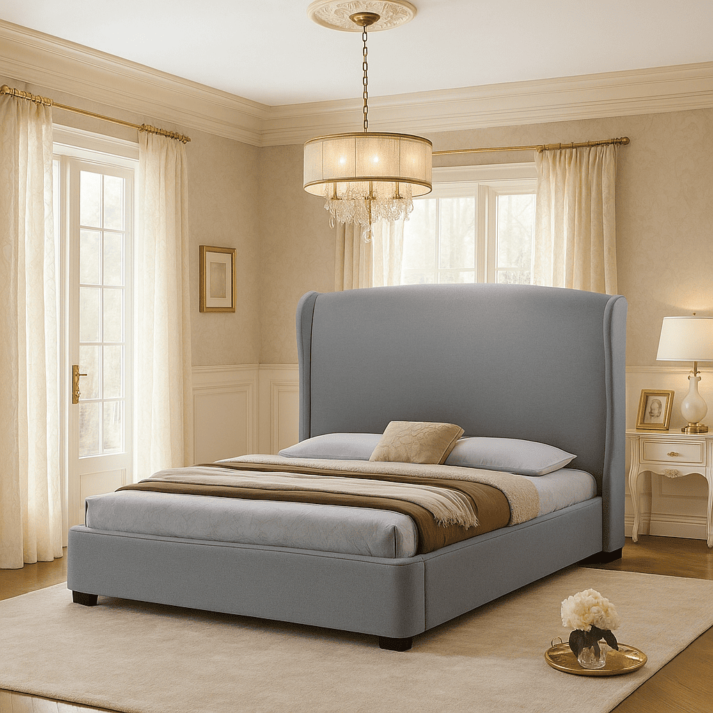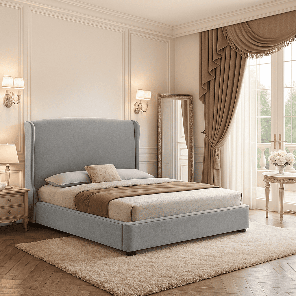 Settling in for the night, ample style, and the Sheila bed were made for one another. This platform bed is outfitted with a solid rubberwood frame, foam padding, and irresistible gray linen. We include wooden slats with your purchase that will serve in place of a box spring. A richly elegant wingback headboard and wood legs with a dark brown stain complete your newest piece of modern bedroom furniture. Made in Malaysia, the Sheila bed requires assembly and should be spot cleaned.