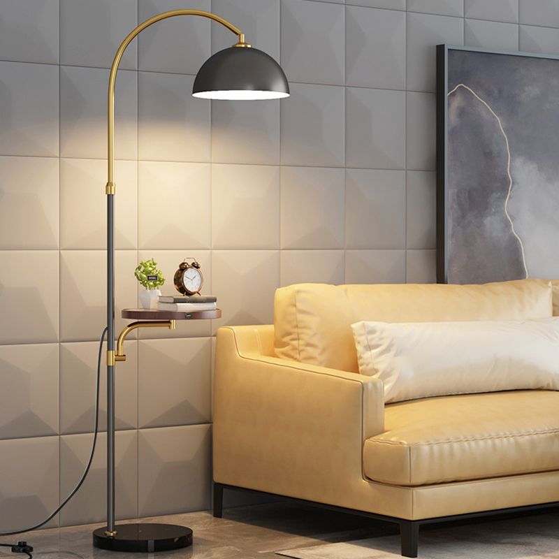Illuminate your space with the Modern Arc Floor Lamp with Built-in Wooden Side Table, a stylish and functional addition to any contemporary home or office. Featuring a sleek black and gold metal frame, a curved arc design, and an integrated wooden tabletop, this lamp seamlessly combines aesthetics with practicality.
