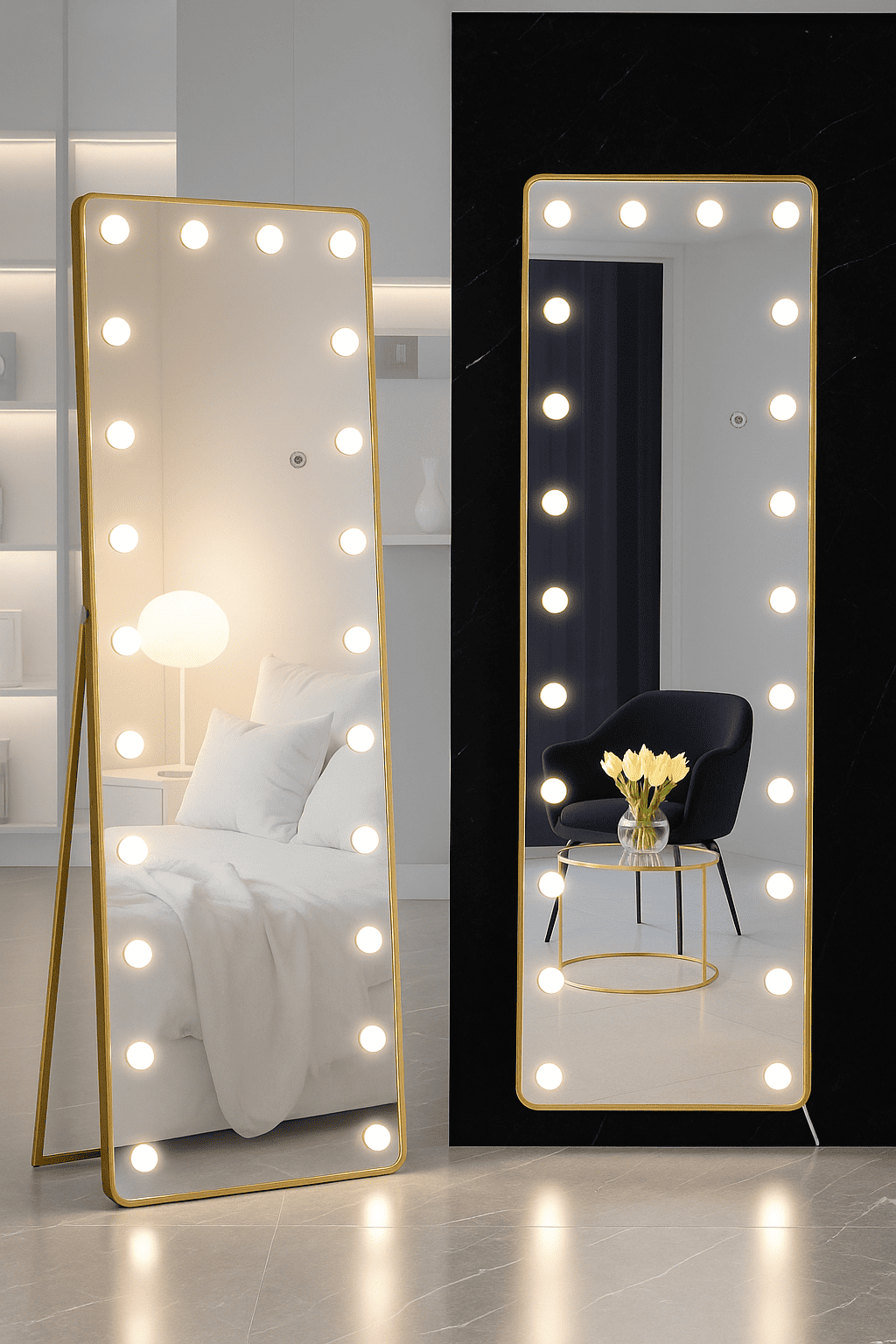 A modern full-length mirror framed with Hollywood-style LED bulbs for flawless lighting. The sleek rectangular design offers crystal-clear reflection, while the adjustable brightness ensures perfect illumination for makeup, dressing, or styling. Built with a sturdy frame and premium glass, this mirror doubles as a functional tool and a statement décor piece. Perfect for bedrooms, walk-in closets, and studios, it adds both elegance and utility to any space.