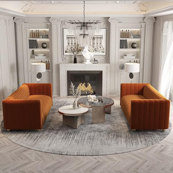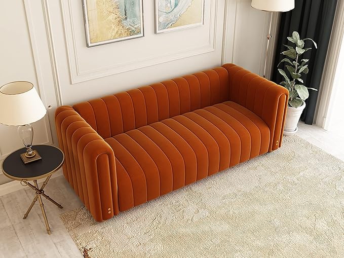 Add a bold touch of sophistication to your living space with the Velvet Luxe Channel-Tufted Sofa. Upholstered in rich burnt orange velvet, this statement piece features vertical channel tufting and plush cushioning that delivers both comfort and style. Its rounded arms and gold-accented wooden feet provide a modern twist to timeless design, making it the perfect centerpiece for contemporary or mid-century interiors. Ideal for upscale homes, lounges, or boutique spaces, this sofa blends elegance, warmth, and durability effortlessly.