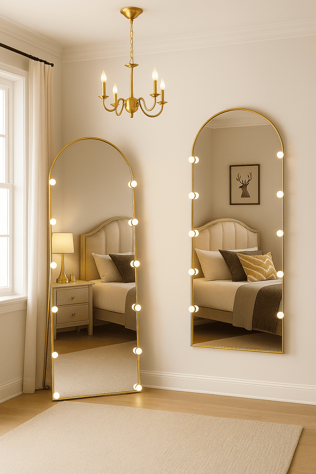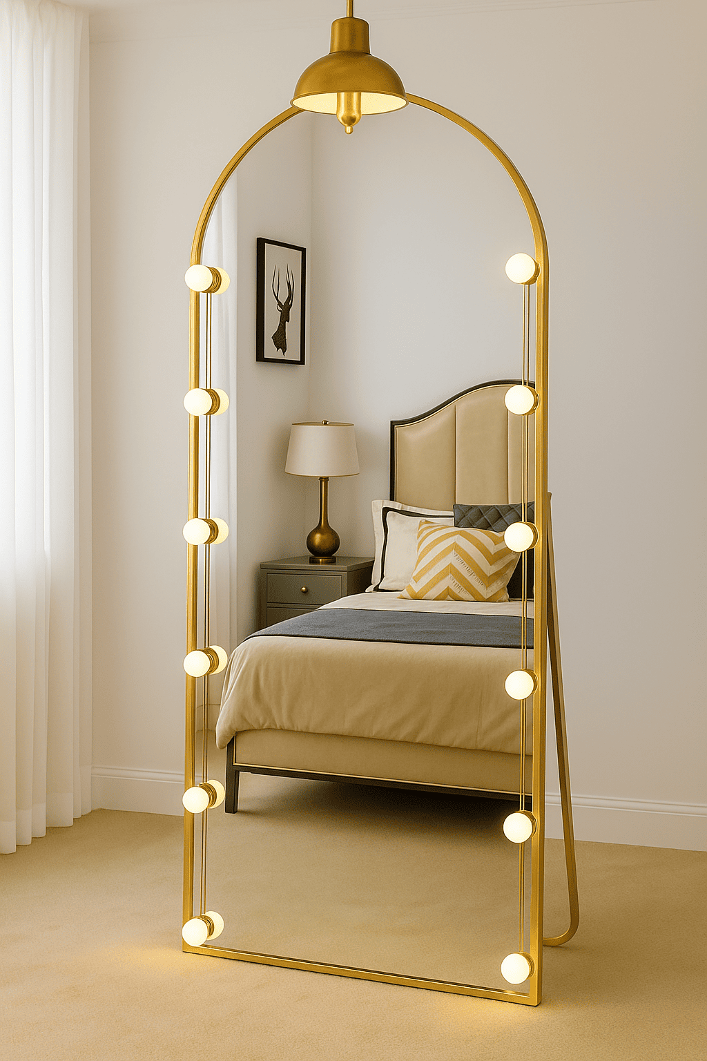 A full-length arched mirror designed with built-in LED bulbs for perfect illumination. The sleek black frame and soft glow create a modern statement piece for bedrooms, dressing areas, or studios. Ideal for makeup, styling, or enhancing room ambiance. Sturdy free-standing design with premium clarity glass ensures both function and elegance.