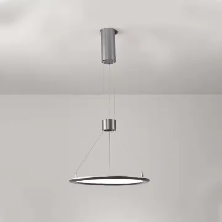This contemporary pendant light features a sleek, disc-shaped LED panel encased in a slim metallic frame with a warm gold or brass finish. The fixture is suspended by adjustable cables, allowing for customizable angles and positioning. Its minimalist and sophisticated design makes it ideal for modern kitchens, dining areas, and commercial spaces. The soft, diffused lighting creates a warm and inviting ambiance, complementing various interior styles, from Scandinavian to luxury modern aesthetics.