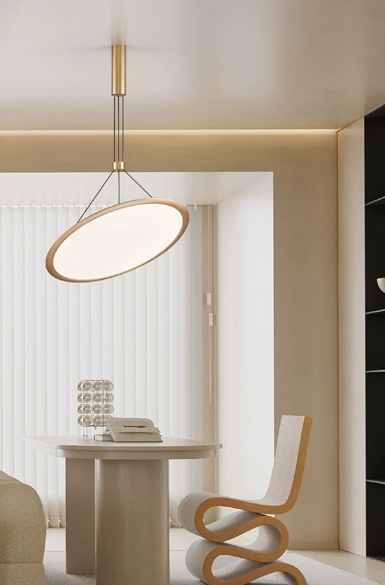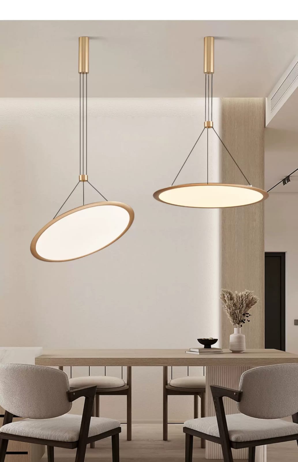This contemporary pendant light features a sleek, disc-shaped LED panel encased in a slim metallic frame with a warm gold or brass finish. The fixture is suspended by adjustable cables, allowing for customizable angles and positioning. Its minimalist and sophisticated design makes it ideal for modern kitchens, dining areas, and commercial spaces. The soft, diffused lighting creates a warm and inviting ambiance, complementing various interior styles, from Scandinavian to luxury modern aesthetics.